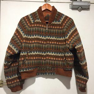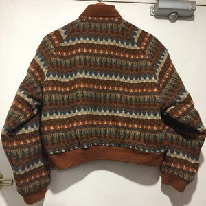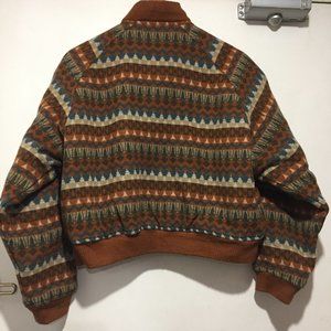 Bang Bang Cropped Jacket, No Label Fits a Medium, Material felt like Wool, Multicolor Print, Quilted Lined, Small Embroidered, Side Pockets, Closure Zipper, Good Condition, Bomber Jacket, Great Look, Great Fitting.