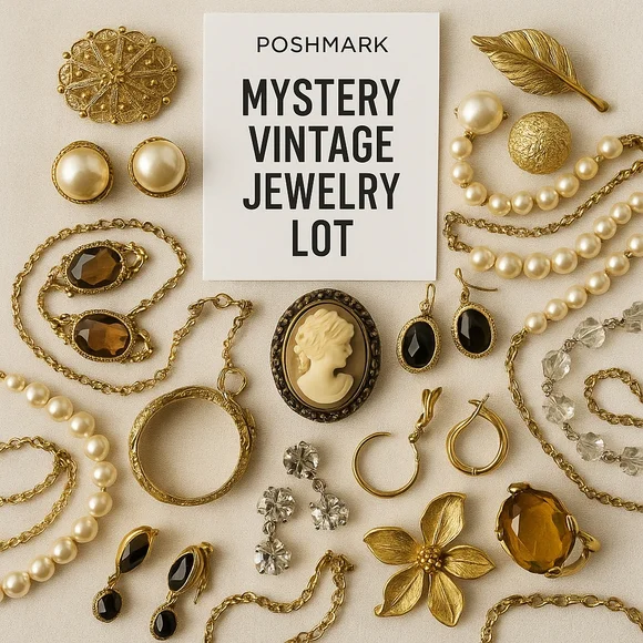 17 pc Mystery vintage jewelry boxes with a mix of authentic pieces—including earrings, brooches, rings, or necklaces. Styles range from subtle to bold, with natural wear that adds character. Each box is different. You can request a style or colour preference, and it will be loosely tailored to match. Simple, genuine, and made to surprise.
