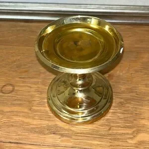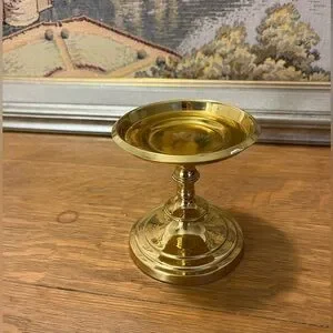 Charming heavy brass-style candle holder with classic shape and elegant shine. Beautiful on its own or paired with other candle holders for a warm, timeless look. Some small imperfections add to its authentic vintage character.