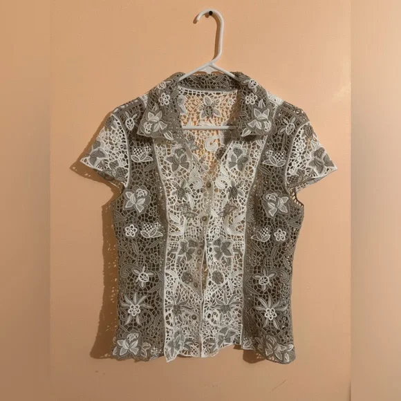 Beautiful women’s vintage button-down short sleeved top, AMAZING QUALITY. It is still very much new, hand washed and never put through the dryer. Fits a size SMALL.