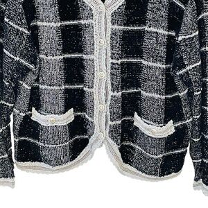 VINTAGE Black & White Plaid Silver Sparkle Cardigan Sweater SZ Small