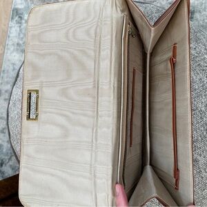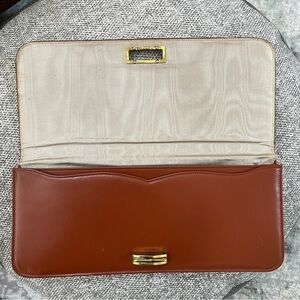 This vintage clutch is a rich brown colour with a cream coloured taffeta-like interior. The bag closes with a gold tone clasp. The interior has two compartments, an open pocket and a zipper compartment as well. A scalloped edge inside when you open the bag. No brand or material tag.