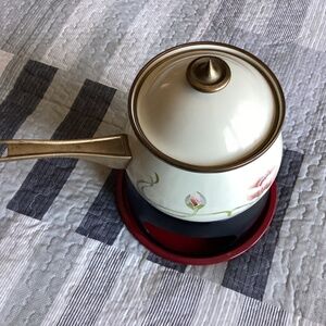 VINTAGE ‘CHEF MATES’ ENAMELED FONDUE SET WITH SOLID BRASS HANDLE & KNOB