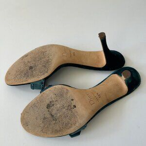 Early-2000s Dior rare vintage mule heels. Crafted in plush teal velvet, they feature a sleek open-toe silhouette and Dior’s signature silver-tone “CD” logo hardware adorned with matching blue studs.
