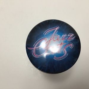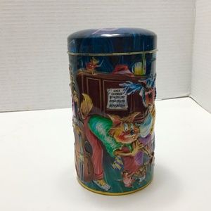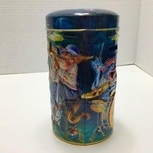 Collectable vintage 1999 Churchill’s English Toffee tin with cartoon embossed Jazz Cats band musicians playing different instruments decorated tin which can also be used as a money box.