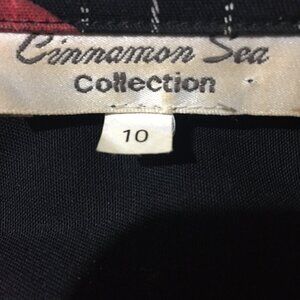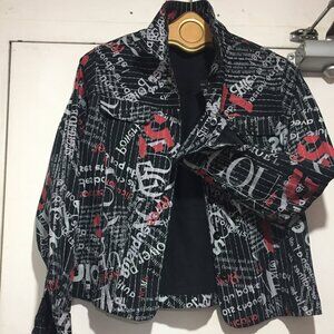 Cinnamon Sea Casual Jacket, Lightweight Size 10, Color Black, Red, White Print, 97% Cotton, 3% Spandex, Breast Pocket Flap, No Pocket, Closure Button Down, Good Condition, Relaxed Fit, Great Look, Great Fit.