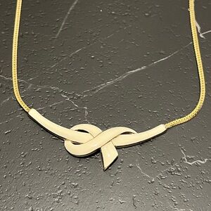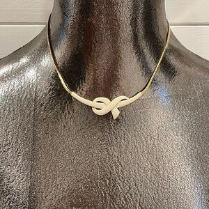 Elegant vintage necklace featuring a sculptural knot centerpiece in cream enamel and gold-tone metal. The flat gold-tone snake chain adds fluidity and shine. A timeless, understated statement piece that pairs well with any neckline.