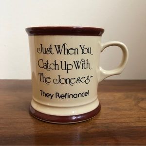Vintage mug that says, “Just when you catch up with the Joneses, they refinance!”. Excellent vintage condition with no chips or cracks, from a pet friendly and smoke free home. 3.5 inches tall x 3.25 inches across (not including handle).