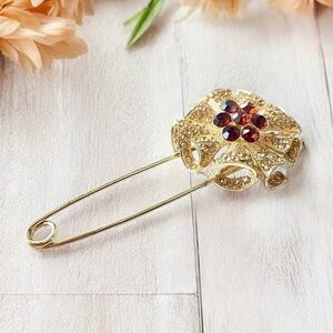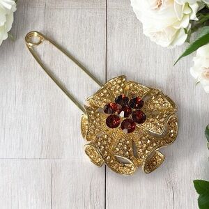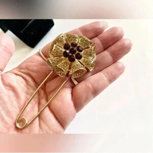 Sparkly Vintage Champagne & Rootbeer Brown Rhinestone Flower Cape / Kilt Safety Pin / Brooch. Hat Pin.