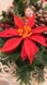 White sleigh is filled with winter greens, pine cones, red berrys, and pointsettas. One smiling snowman in the centre.
