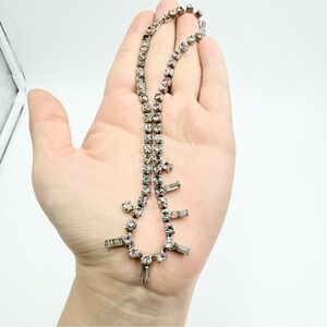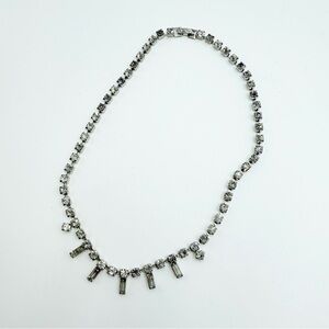 This vintage choker necklace features a stunning Art Deco-inspired design with sparkling rhinestones set in silver-tone metal. A timeless statement piece perfect for adding vintage glamour to any outfit.