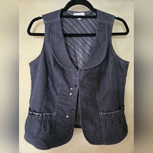Stylish gray denim vest featuring button details. Perfect for layering. Pre-Loved and in Great Condition Beautiful Vintage Piece!!! Size : M Measurement : . Pit to pit : 19'' Material : . 72% Cotton . 24% Polyester . 4% Spandex