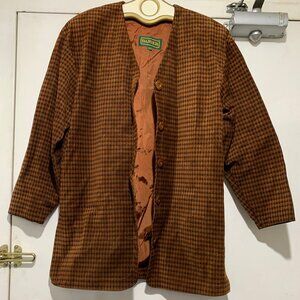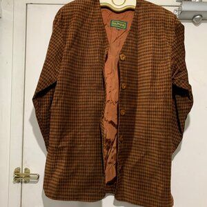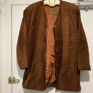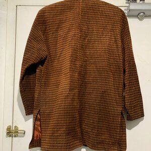 Danier Tall Jacket, Lightweight Size XS, Color Brown Plaid, Missing Fabric Tag, Leather Texture, Lined, Shoulder Pad, Side Split, No Pocket, Button Closure, Good Condition, Relaxed Fit, Great Look, Great Fit.
