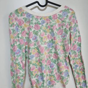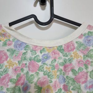 vintage floral leotard! never worn, pastel colors, comfortable stretchy fabric. base is an off-white- ish tint, with slight discoloration around the neckline due to time, as shown in picture. has metal snaps on the crotch. truly an awesome piece.