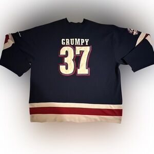 Walt Disney World Grumpy Miners hockey jersey. Features “C” captain designation, Grumpy dwarf front logo, Grumpy #37 on back, red and beige stripe detail, lace-up neck and reinforced elbows. Measures 29”W x 32”L. In pristine condition.
