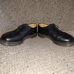 This product is a vintage pair of Dr. Martens black leather brogues, made in England with a round toe shape and lace-up closure. These size 9 UK shoes are suitable for travel, casual wear, and workwear, featuring a rubber outsole for durability.