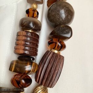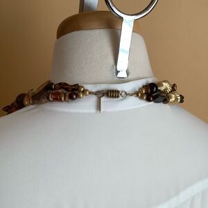 This unique statement necklace was made by vintage Quebec designer, Lucille Gauthier. It features a substantial, weighty design inlaid with seed beads, gold metal, amber beads, gold and brown cords, large shells and gemstones. These handmade, one-of-a-kind pieces were highly sought after and very expensive in the 1980's.