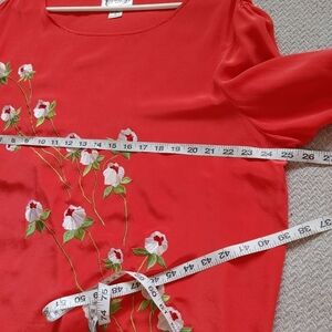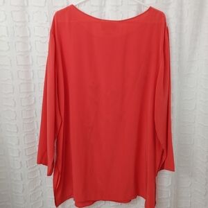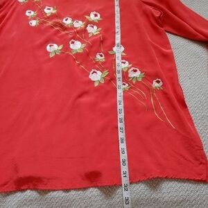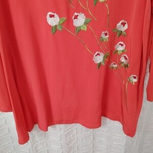 Simply stunning orange 100% silk tunic with delicately embroidered flowers. Side slits (9.5"). Has been dry-cleaned. Last 3 photos show very minor unnoticeable flaws in the fabric (common with silk) and there's a little bit of discolouration and a small slit on the back neckline where the tag is. In otherwise perfect condition.