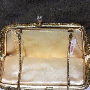 Vintage Embellished Mini Purse, Dark Yellow Sequin Shining Light Catching, Lining, Inside Pocket, Small Chain Strap, Closure Small Lock, Three Loose Beads, Looks Great and is in Good Condition.