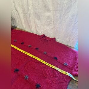 Gorgeous vintage red knit sweater from ESPRIT Sport, featuring intricate cable knit cuffs, embroidered snowflakes and a large woven floral/holiday-inspired motif at the front and back. Made from 100% wool — thick, warm, and perfect for cozy winter days or festive outfits. Taille non indiquée ⚠️ (voir les mesures sur photo).