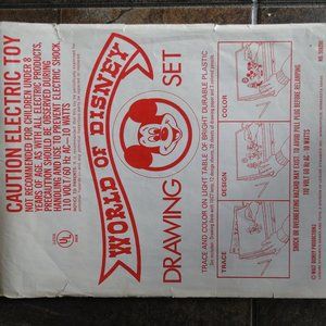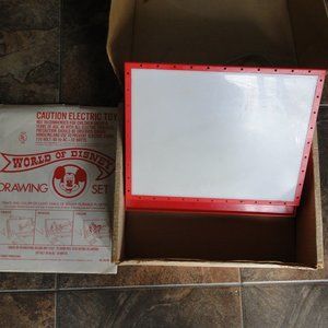 World of Disney Light Up Drawing Desk Eldon NO. 508290 c-1970 I really nice toy from the 1970, made for Walt Disney Productions by Eldon Toys, Minneapolis, MN The drawing set originally came with the following: 1 Drawing Desk with lamp, 12 Design Sheets. This set includes: 1 Drawing Desk with lamp, 12 design sheets and the original box. The original box is in good to poor shape. The desk lamp works great as seen in the photos -- Set includes design sheets of Mickey, Minnie, Donald Duck And Family, Robin Hood, Dumbo, Goofy, Pluto, Aristocats, Sword and the Stone, Snow White And The Seven Dwarfs, Mary Poppins and Jungle Book. This is a truly nice piece to add to any Disney or Vintage Toy Collection. Thank you.