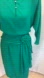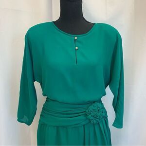 Excellent used condition. Beautiful emerald green color. Zipper closure with a button closure over top of it. Asymmetrical wrapped skirt line. Ruching through the waist to give you a cinched flattering silhouette. Shoulder pads. Size tag has worn off but fits like a size 8 to 10/ M. Please confirm with photo measurements which are approximate before you purchase