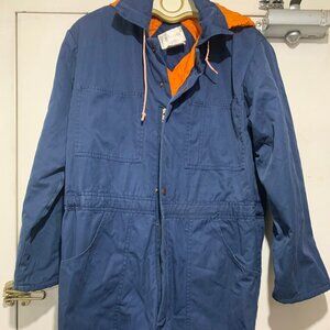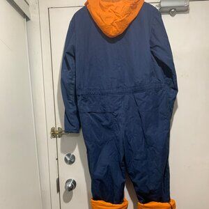 Fracassi Unisex Hooded Jumpsuit, Size S, Color Blue, Orange Lining, 65% Polyester, 35% Cotton, 100% Nylon Lining, Breast Pockets, Side Pockets, Back Pocket, Closure Zipper, Snap Buttons, Sleeves Inseam Color Faded, Hemming Poor Stitching, in Good Condition, Winter Jumpsuit, Great Look, Great Fit.