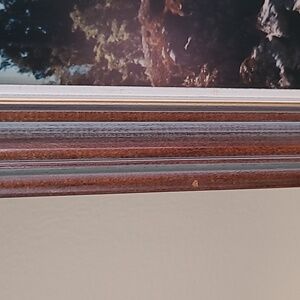 Enhance your home with this vintage, serene framed landscape photography art by Ulrich Walthert. It features a tranquil 'Hokitika Gorge' scene, including the Upper Gorge suspension bridge and Hokitika River. The artwork is beautifully complimented by a brown frame with a glass front, adding a touch of elegance to any room.