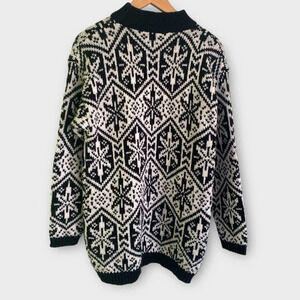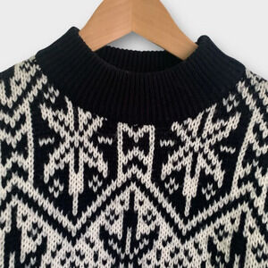 This vintage Nordic sweater by Assertif features a bold black and white geometric snowflake pattern. Made in Hong Kong, it has a thick knit construction with a mock neck and ribbed cuffs and hem. The chunky knit gives it a cozy, oversized feel—perfect for cold weather, cabin stays, and après ski vibes. A true retro gem with a grunge-meets-classic aesthetic.