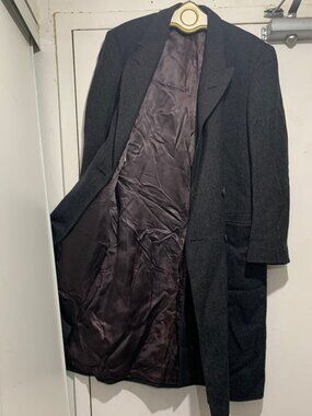 Garvey's Double Breast Coat, Midweight, Size 42/L, Color Grey, 100% Wool, Lined, Shoulder Pad, Front Pockets, with inside Pockets, Back Vent, Closure Buttons, Good Condition, Made in England, Formal/ Casual, Great Look, Great Fit.