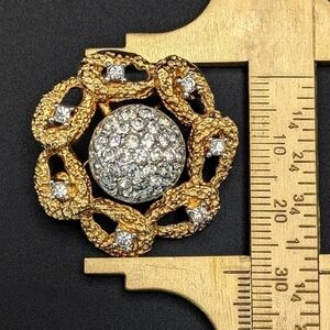 Vintage Pavé Rhinestone Textured Two Toned Brooch - Unsigned Beauty. the center has a gorgeous pavé rhinestone design, and the bright shine of the outer rhinestones against the rich gold tone of the textured chain-like perimeter make this little beauty an absolute STUNNER! small but mighty, at just over 1" in diameter (29mm). no notable flaws, however the concave of the back does show some signs of age (see pictures). in wonderful vintage condition for an item of this age and material! costume jewelry. estate sourced, history unknown.