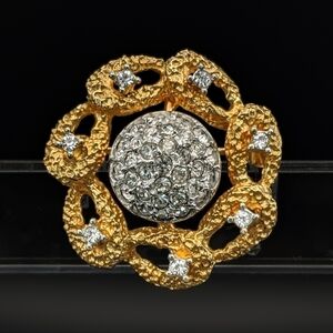 vintage, pavé, rhinestone, accents, crystal, gold toned metal, costume jewelry, statement brooch, pin, collection, collectible, cottagecore, fairy, Fairycore, unsigned beauty, unisex, texture, round, lapel, tie, estate
