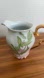 Vintage ornate ceramic pitcher featuring a floral botanical design. White with pale pink on the bottom of the jug and green and pink floral. Accented with a gold trim around the scalloped bottom and a gold handle. On the bottom of the jug is a signature that I think says "Jannet Watsco" and "O.P.A.G. 888/85" in gold.