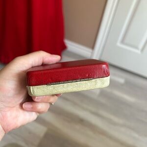 Located at a vintage shop are these stunning cufflinks and bar tie clip gift set. the primal focal is blood red likely glass with engraved gold horse.