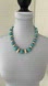 Vintage graduated bead necklace in cream and blue alternating bead colours with silver tone spacers in between. Push button clasp. Unsigned. This does not feel like a plastic material, it is heavier weight.
