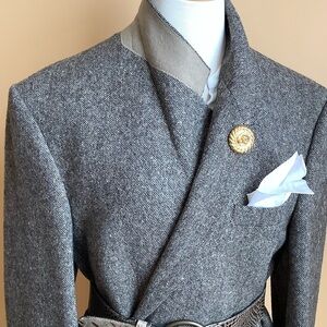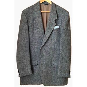 Be the envy of the town in this vintage pure virgin wool Donegal Tweed blazer. Classic tailoring with luxurious details, this two-button, three-pocket jacket features notched lapels, a single back vent and full lining. Leather-covered buttons complete the look of sophistication and elegance in this unique blazer. Shades of black, white and tan contribute to a cool neutral colour palette.