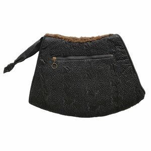 VINTAGE HAND CRAFTED NEUTRAL BROWN FUR BLACK EMBROIDERED MUFF HAND WARMER POUCH BAG, a vintage authentic brown fur black embroidery muff hand warmer pouch bag 2 in 1 convenient winter accessories in neutral trendy tones yet timeless and classic with a satin strap - outter zipper pocket and useful storage inside yet stay open (no fastening facilities).