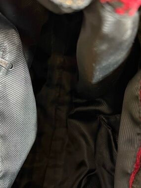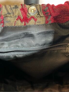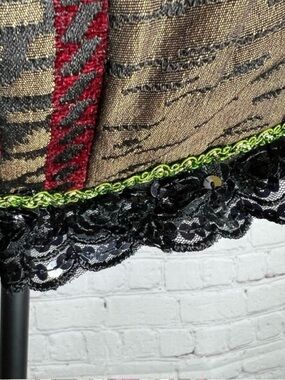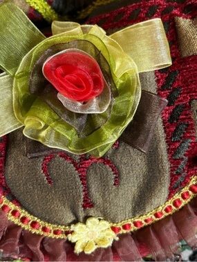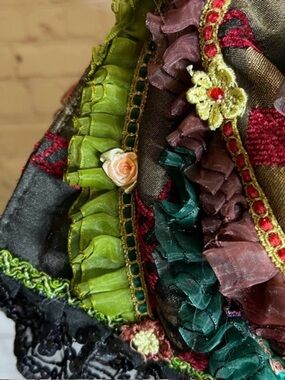 This unique piece features a mix of tapestry fabrics in earthy tones of olive green, burgundy, and gold. Adorned with layered lace, embroidered details, and decorative ribbon flowers, this bag has a true vintage-inspired, artistic