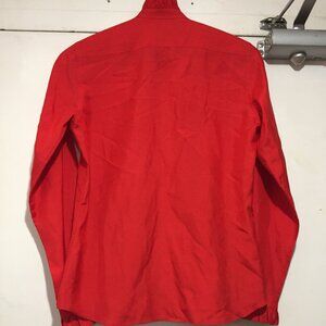 Harry Rosen Silk Lightweight Shirt, Size 8, Color Red, 100% Silk, Ruffle Collar, Sleeve Cuffs, Closure Button Down, Good Condition, Relaxed Fit, Great Look, Great Fitting.