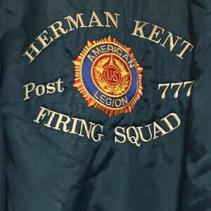 Vintage Holloway Herman Kent Firing Squad Bomber Jacket, Lightweight Size L, Color Blue, Trim Red, Blue, White, 100% Nylon, Quilt Lining 100% Nylon, Side Pockets, Embroidered, Closure Snap Button Down, Color Faded, Small Spots, Small Distressed, Good Vintage Condition, Made in USA, Relaxed Fit, Great Look, Great Fit.