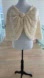 Lacy open knit capelet shawl in a neutral cream colour does up at the front with one large button. Front is gathered. No material tag. This feels like mohair or a mohair blend.