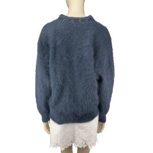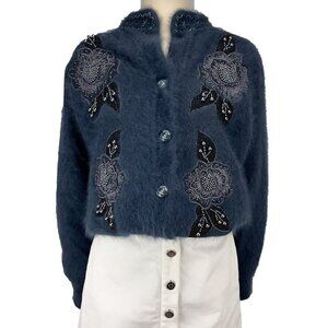 VINTAGE ROSA Angora Fluffy Embellished Floral Beaded Blue Grandma Cardigan s S-M