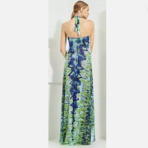 GORGEOUS, SUPER RARE, SOLD OUT, NEW $995 JEAN PAUL GAULTIER MAXI DRESS IN HIS ICONIC MESH FABRIC IN GORGEOUS BLUE/GREEN/MULTI-COLOR PAINTERLY CHEVRON PRINT WITH TIE HALTER NECKLINE. ASYMMETRIC HEM. MADE IN ITALY OF POLYAMIDE/NYLON. LINED IN COLOR-COORDINATED BLUE LINING. UBER FLATTERING, LIGHTWEIGHT MESH FABRIC. SIZE LARGE. (ALSO AVAILABLE IN XL UNDER SEPARATE LISTING). OF COURSE, THIS FABRIC ALLOWS A LOT OF LATITUDE IN THE SIZING DEPARTMENT, SO IT WILL ACCOMMODATE A SIZE SMALL TO MEDIUM.