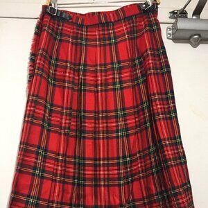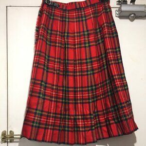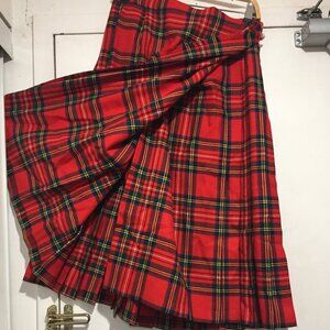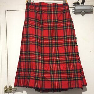 Jedburgh Kiltmakers Midi Pleated Skirt, Lightweight Size 10, Waist Size 30, Red Plaid, Pure Wool, Closure Side Belt Buckles, Large Pin, Good Condition, Made in the United Kingdom, Great Skirt, Great Look, Great Fit.