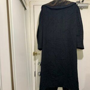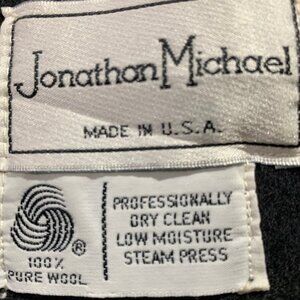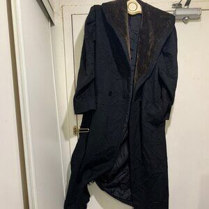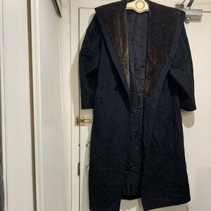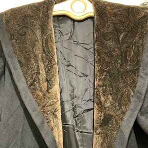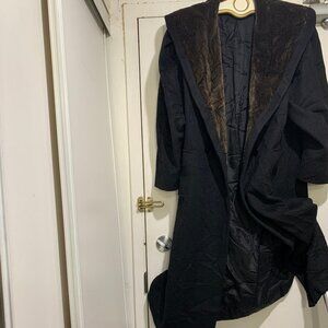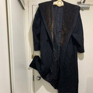 Jonathan Michael LongTrench Coat, Lightweight, Missing Size Tag, Fit Size L, Color Black, Collar Multicolor Velvet Pattern, 100% Wool, Lined, Shoulder Pad, Side Pockets, Big Collar, Closure: Double Breast Single Button, Good Condition with Small White Spots from the Winter Salt, Formal/ Casual, Great Look, Great Fit.