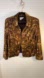 Unique vintage Joseph Ribkoff jacket in a golden tan and chocolate brown tribal print jacquard pattern.