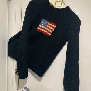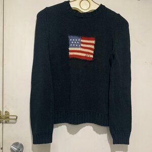 Vintage Knit Sweater, Lightweight, Size M, Color Blue, Front American Flag Knitted, 100% Cotton, Crewneck Pullover, Neckline Thread Pulled, in Good Condition, Casual Sweater, Great Look, Great Fit.