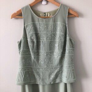 Front of the top section if fully beaded and embroidered in a monochromatic sage green design