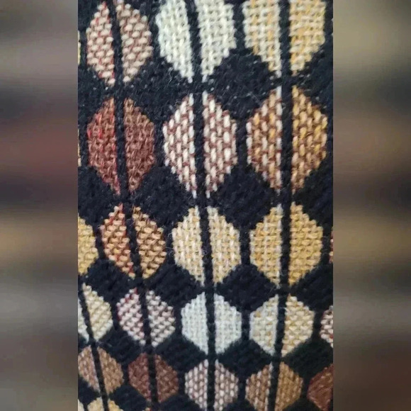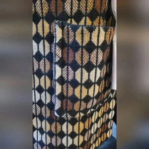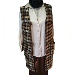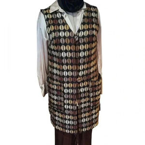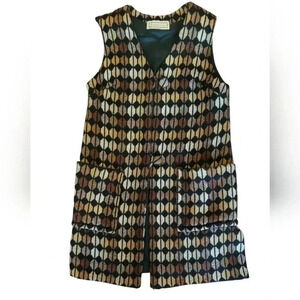 Fun rare find from the 60 or 70's Era. Ling, knew length (depending on how tall you are) sleevless coat or vest. Has the weight and lining of a coat...perfect layer for fall sweaters!
