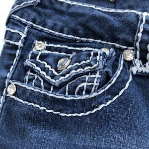0829 WHITE JAPANESE STITCHING !! VINTAGE STONEWASHED HEAVYWEIGHT DENIM 97% COTTON !! DECORATED FLAP POCKET crystal stud missing on back right pocket !! ALTERED 31โ inseam !! 8โ MIDRISE !! VINTAGE QUALITY DENIM and COOL style ๐